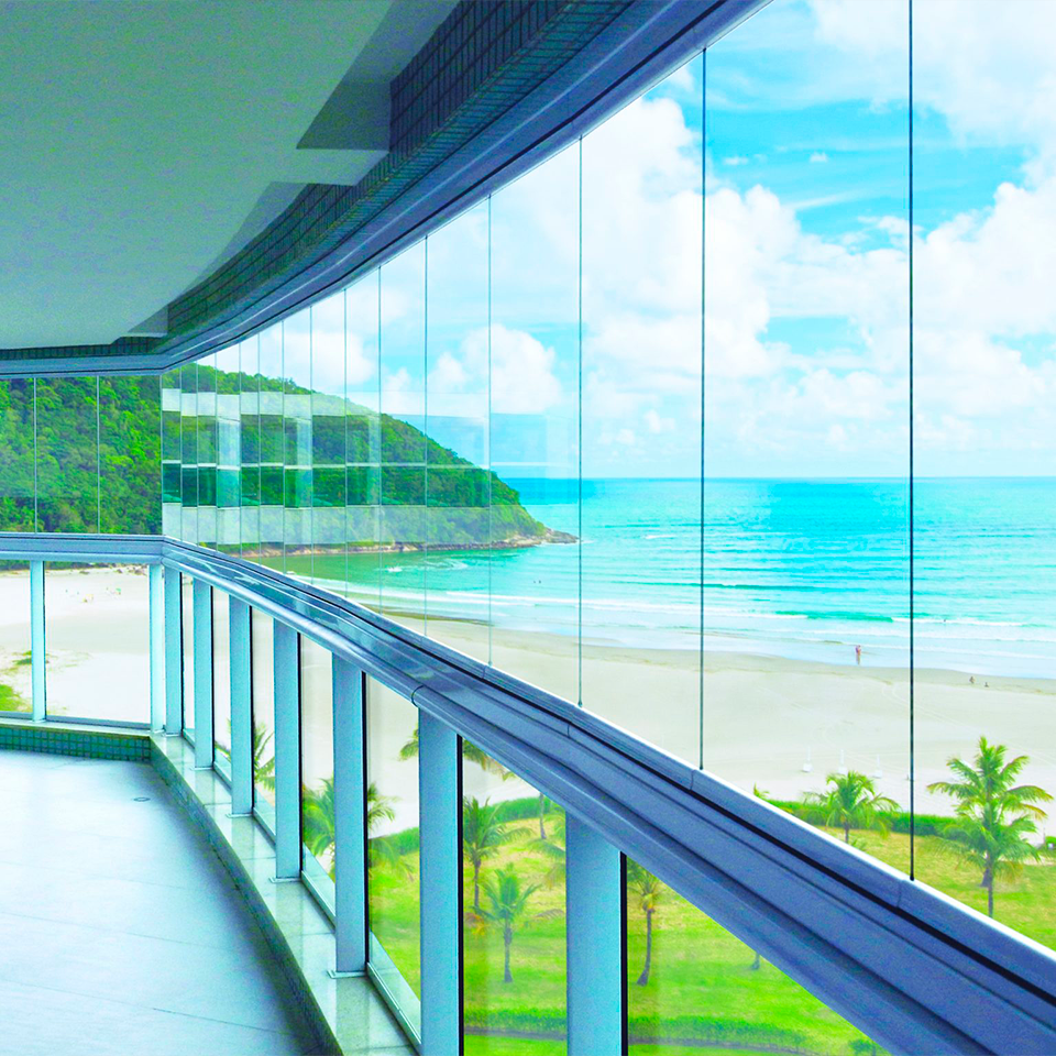 Transforme sua sacada em um ambiente sofisticado e protegido com o sistema premium de envidraçamento sem roldanas da Euca Glass.